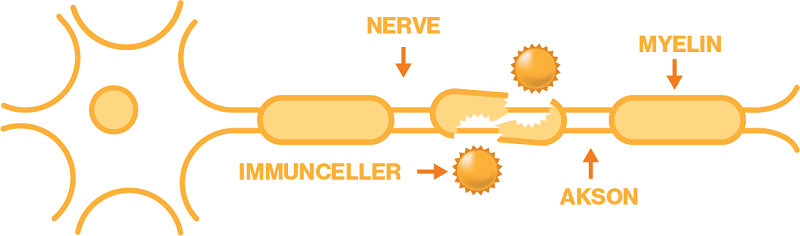Ved MS angriper kroppens eget immunforsvar nervecellene og skader myelinet – det isolerende laget som omgir cellene. Skaden gjør at signalene i kroppen ikke sendes på riktig måte, og dette forårsaker MS-symptomene. Symptomene på MS varierer fra person til person, avhengig av hvor i kroppen nerveskaden er.1